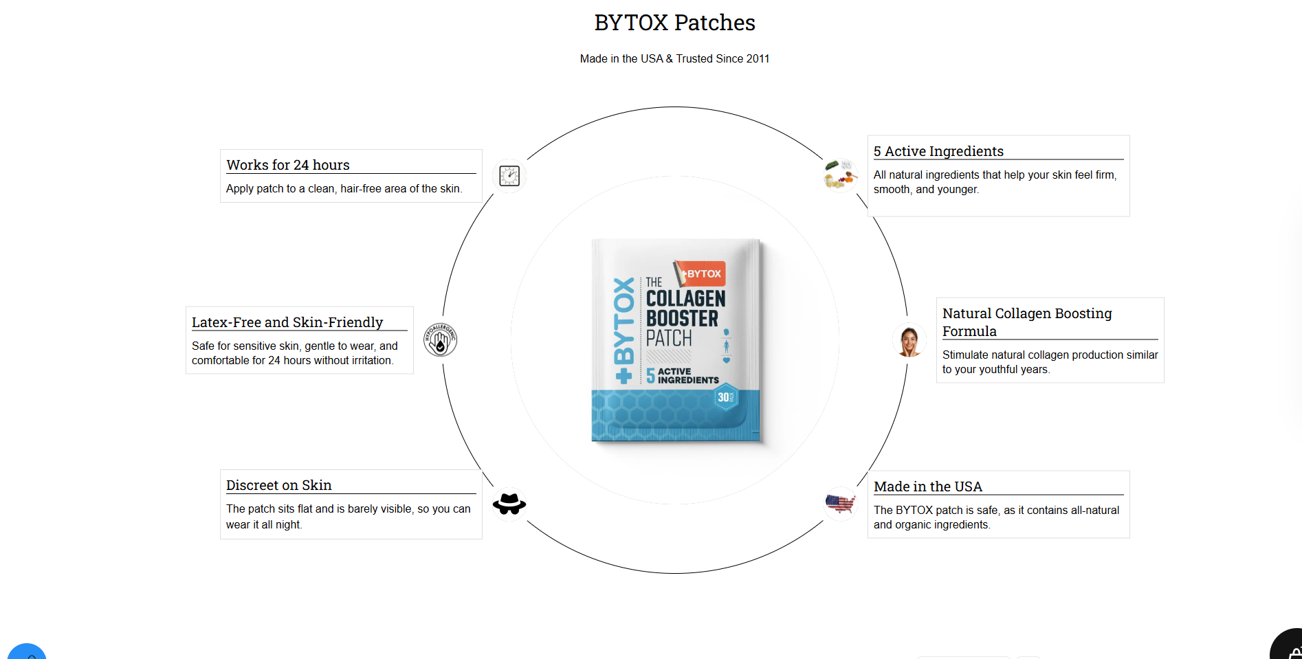 The BYTOX Collagen Booster Patch delivers ingredients that help your skin feel firm, smooth, and refreshed. Apply to clean skin and let the patch release nutrients for up to 24 hours. No pills. No powders. No mixing. Made in the USA.