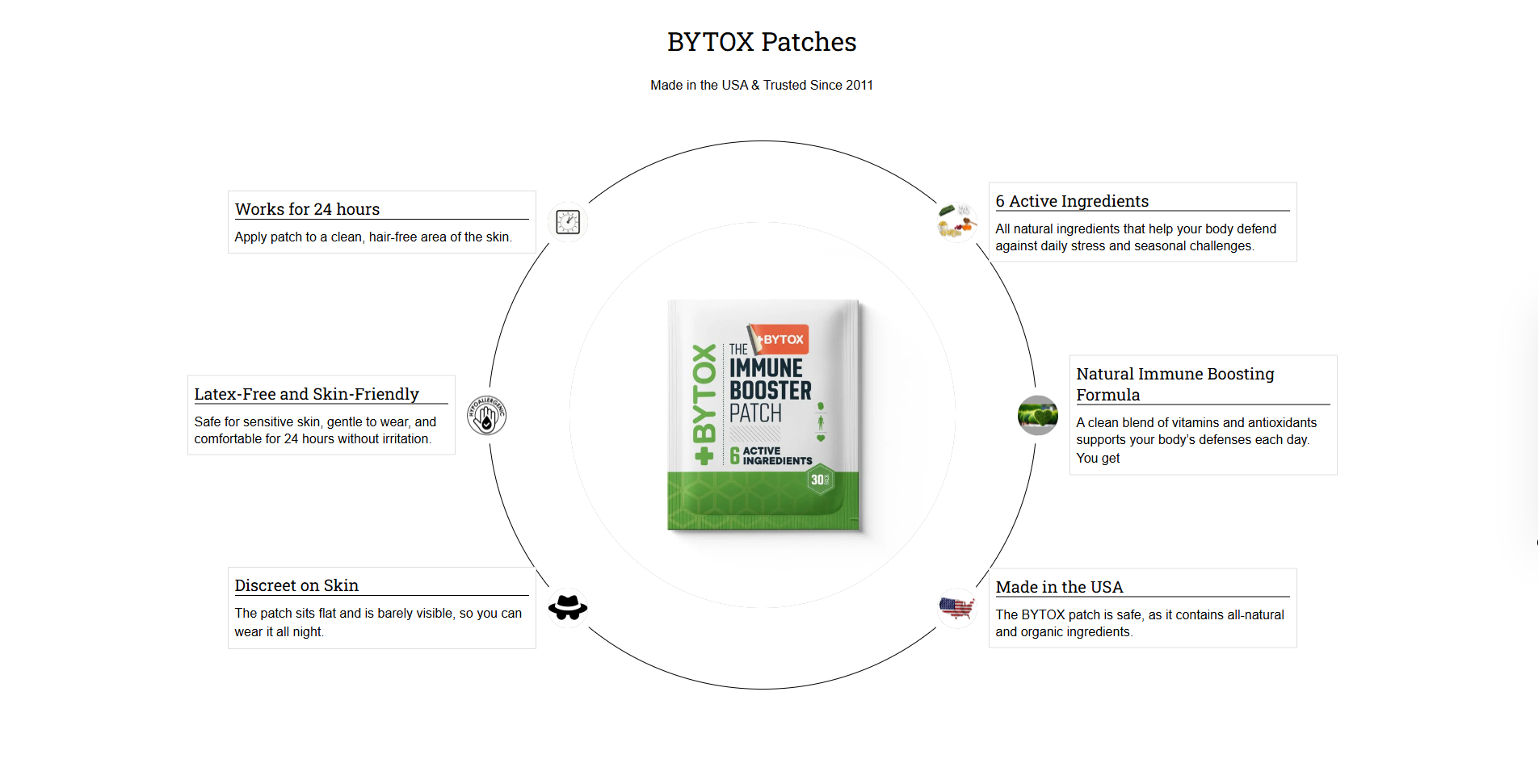 Your body works hard every day, and small gaps in support add up. The BYTOX Immune Patch fills those gaps with steady nutrients your system needs to stay strong. You place it on once and give your body a quiet advantage from morning to night. It fits busy weeks, travel days, and moments when you want extra protection. It helps you feel steady, focused, and ready for anything.
